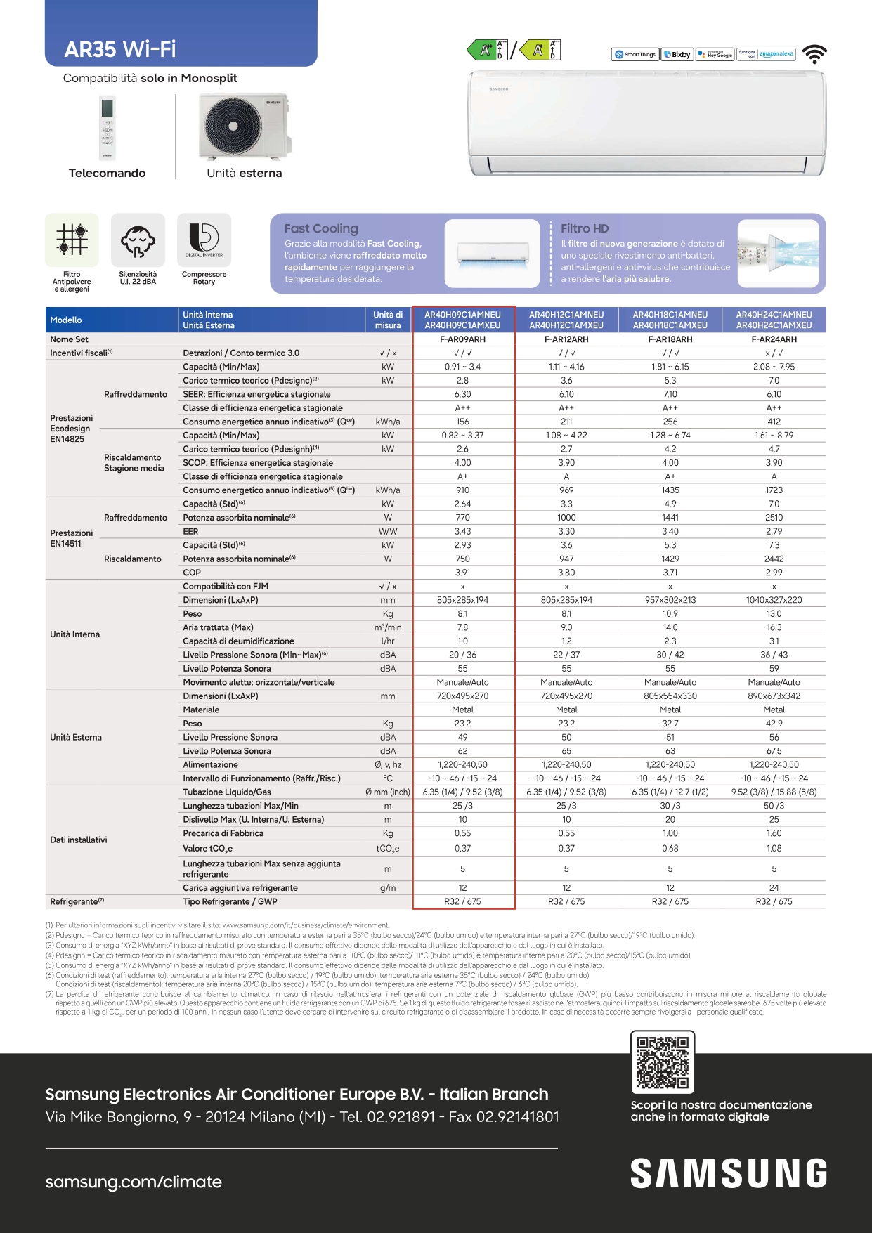 Il climatizzatore Samsung AR35 da 9000 BTU rappresenta l'equilibrio perfetto tra l'affidabilità tecnologica di Samsung e le nuove esigenze di connettività domestica. Progettato per ambienti fino a circa 20-25 mq, questo modello combina il gas ecologico R32 con una gestione energetica di classe A++, garantendo prestazioni elevate e consumi ridotti.