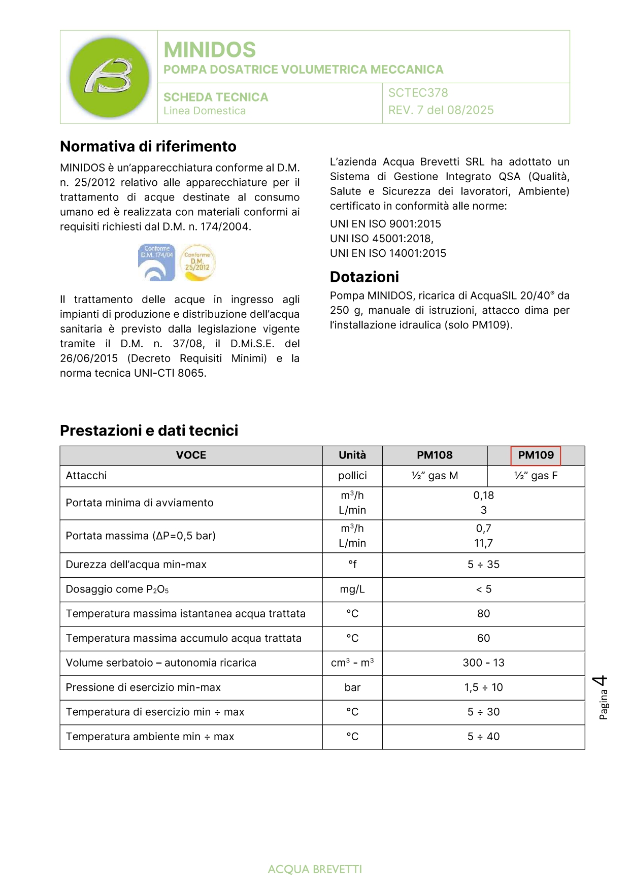 MINIDOS è la pompa dosatrice volumetrica meccanica compatta, specificamente progettata per il dosaggio preciso e costante di ACQUASIL 20/40, l'anticorrosivo e antincrostante a base di polifosfati. Ideale per la protezione degli impianti di distribuzione dell'acqua calda, questa pompa garantisce l'efficacia del trattamento con la massima semplicità di installazione e manutenzione.