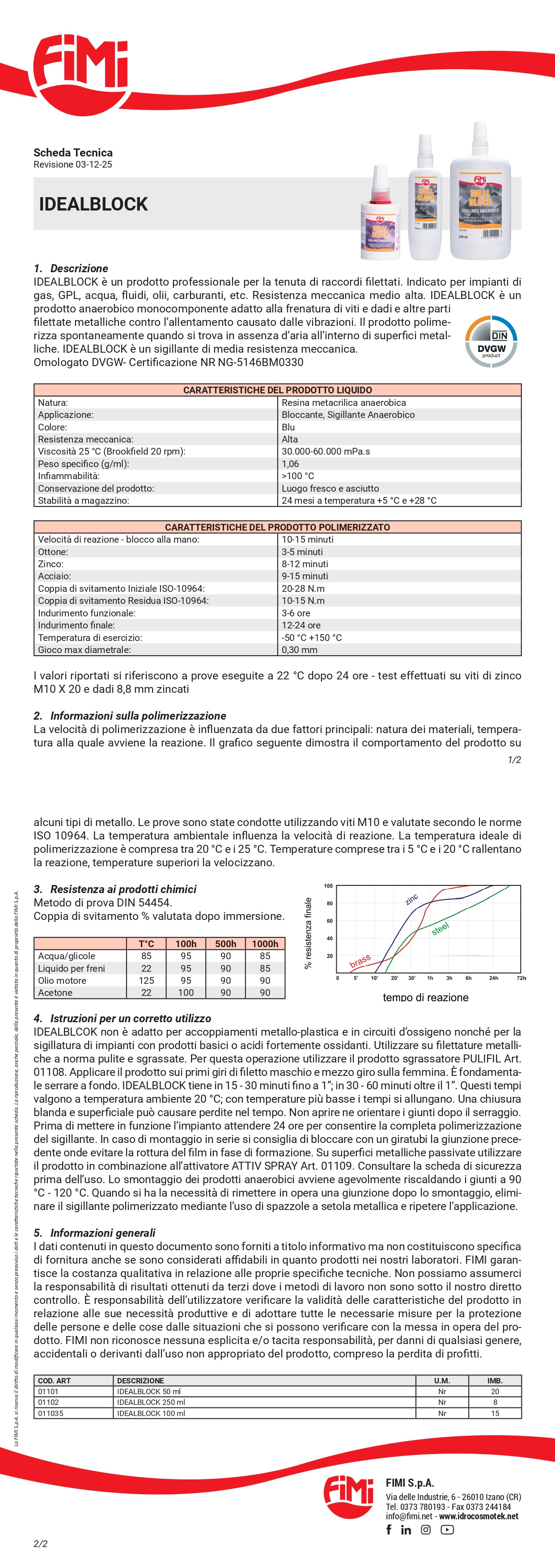 IDEALBLOCK è il sigillante anaerobico ad alte prestazioni progettato per la tenuta stagna di raccordi filettati in metallo. Grazie alla sua formula avanzata, polimerizza spontaneamente quando confinato tra le superfici metalliche in assenza di ossigeno, trasformandosi in un film plastico ultra-resistente capace di sigillare e bloccare il raccordo contro vibrazioni e sbalzi di pressione.