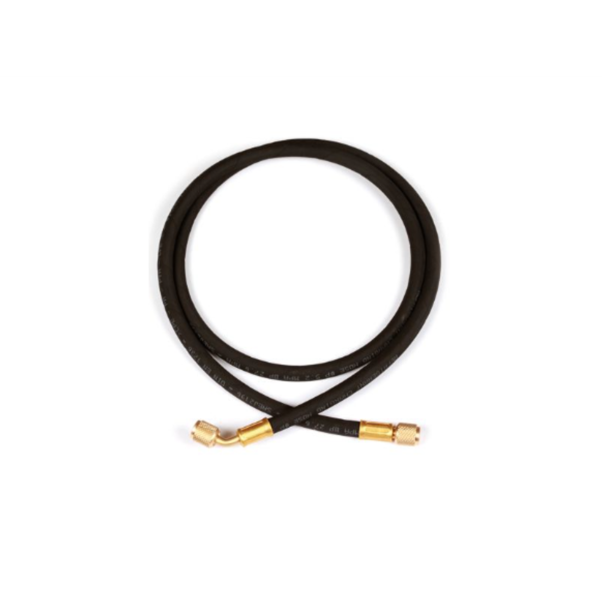 Tubo professionale per ricarica e diagnosi impianti HVAC di colore blu. Attacchi: 1/4 SAE (Diritto x 45°) con depressore. Lunghezza: 1500 mm. Uso: Collegamento manometri e unità di condizionamento. Plus: Alta flessibilità e tenuta ermetica garantita a.